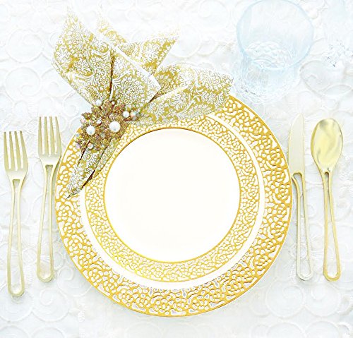 - PERFECT DESIGN: Beautiful Chic Designed White with Gold Lace Plates Paired with Intricate Disposable Gold Plastic Utensils Makes This Party Pack Plastic Dinnerware Set Sleek and Fashionable For Any Upscale Event, Wow Your Guests At Your Next Wedding, Anniversary, Holidays or Special Event