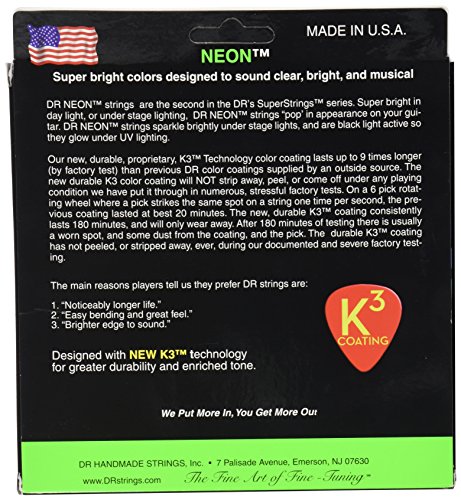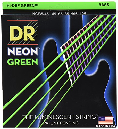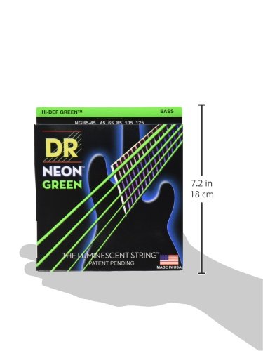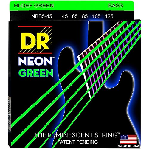 Studio : DR Music Publisher : DR Music Binding : Electronics Product Description NEON Hi-Def Green Bass 5 String 45-125. Super bright colors that will sound clear, bright and musical. NEON's are 100% black light active and will glow under ANY UV light source. 0