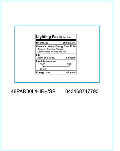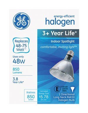 Studio : GE Lighting Publisher : GE Lighting Binding : Tools Home Improvement Product Description GE 74779 Energy Saving Halogen 48 Watt Indoor Spotlight Par30 Long Neck 75-Watt Replacement 74779 - 48PAR30L/HIR /SP GE Long Life HIR PLUS PAR30L. Saves energy compared to standard, Wattage: lamps Bulb PAR30L Base: Medium Screw, Wattage: 48 Voltage 120 Initial Lumens 850 Color Temperature 2750 K, Rated Life: 4200 hours, Product Code: 74779, Description: 48PAR30L/HIR /SP, UPC: 043168747790. The Primary Application: Indoor Spotlight . Halogen lamps provide a small, white light source with excellent color rendering. Unlike standard incandescent lamps, halogen lamps use a halogen gas which allows the bulbs to burn longer without sacrificing light output. Compared to incandescent lamps, halogen lamps provide crisp white light, excellent beam control, compact size, high lumen maintenance, and a longer life. For product questions regarding GE Lighting products, please call GE Hotline 1-800-435-4448, Monday ? Friday, 8:00 a.m. - 6:00 p.m. EST Follow the recording prompts or ‘stay on the line’ to speak directly to a customer service rep. 0