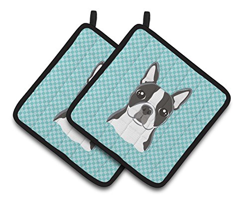 Caroline's Treasures Checkerboard Blue Boston Terrier Pair of Pot Holders BB1141PTHD, 7.5HX7.5W, Multicolor