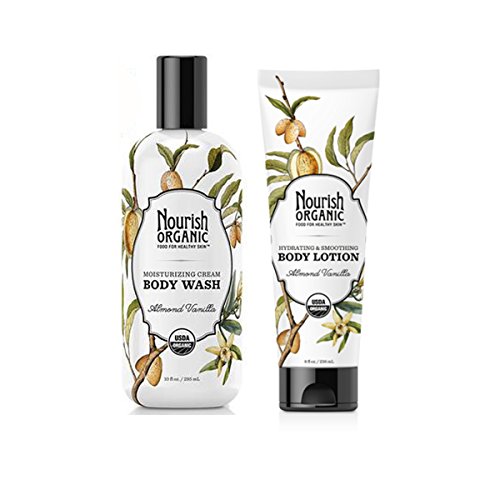 This bundle includes one 10 fl. oz. bottle of Nourish Organic Almond & Vanilla Body Wash and one 8 fl. oz. tube Body Lotion with nourishing coconut milk, antioxidant-rich Vitamin E, organic Aloe and Acai oils
