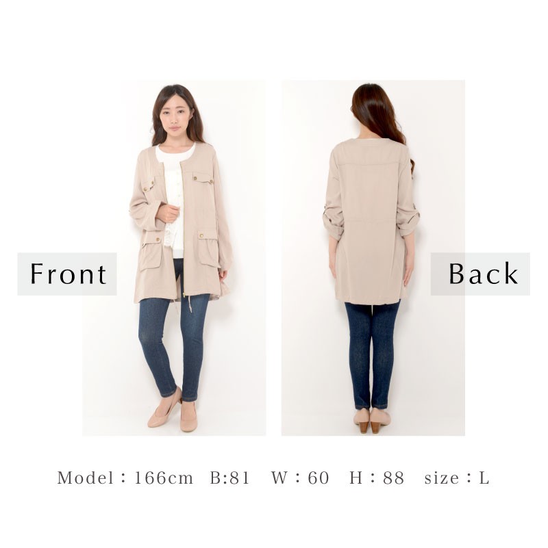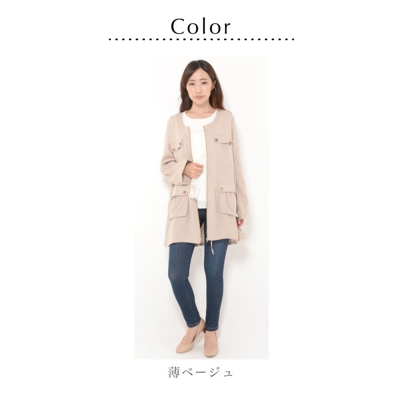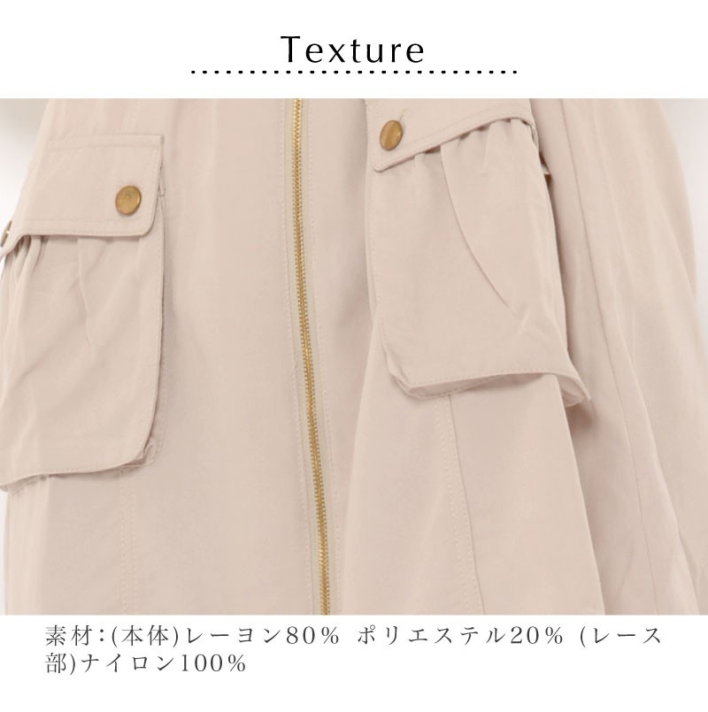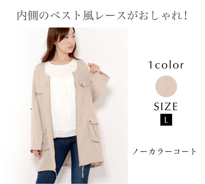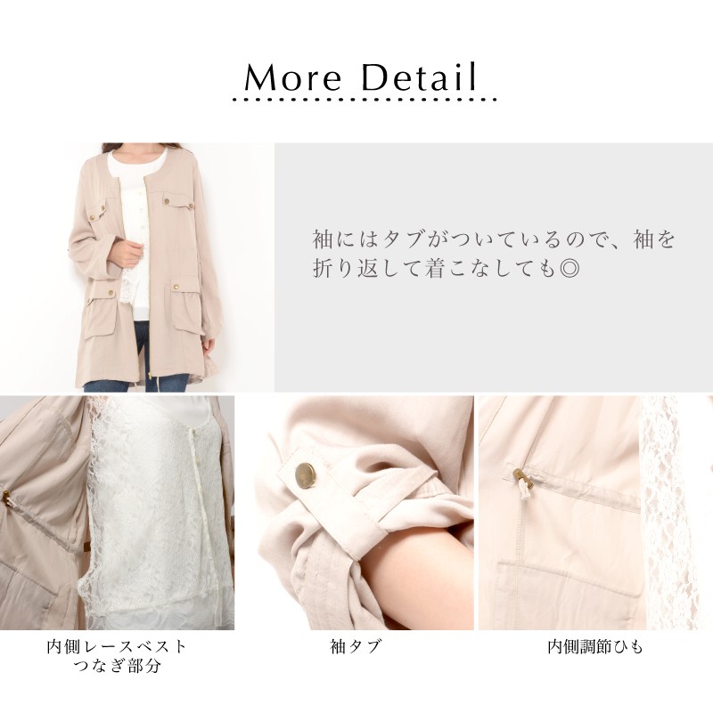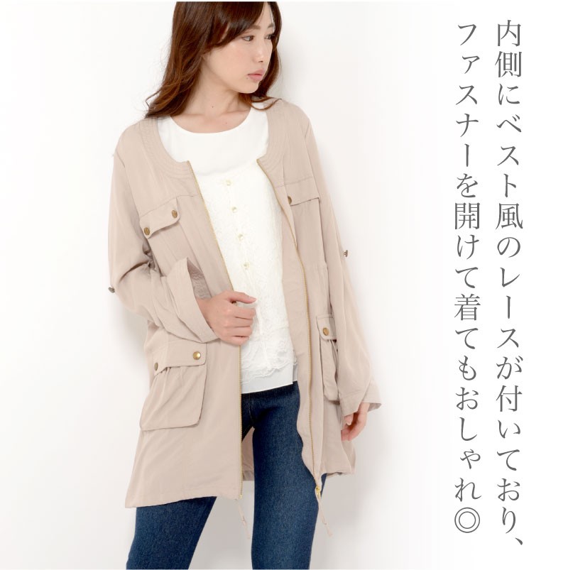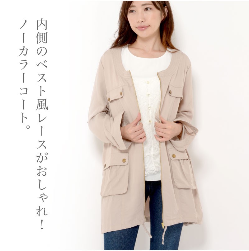 | サイズ | Lサイズ | | 実寸 | 表記は全てcm [L] バスト108(86-94) 着丈79 袖丈59 肩幅40 ●ウエスト内側ひも使い 裾ひも使い 袖タブ (前)左右ポケット 内側レース風ベスト | | 素材 | (本体)レーヨン80% ポリエステル20% (レース部)ナイロン100% | | 生産国 | 中国 | | 裏地 | なし | | 生地の伸縮 | なし | | 生地の透け感 | なし | | カラー | 01. 薄ベージュ | | 注意点 | ▼綿混合商品は洗濯時に多少縮む事がございます。 ▼パソコン、モニター等の環境により、実際の商品素材カラーが多少異なる場合が御座います。予めご了承ください。 ▼お手数ですが必ずお買い物ガイドを一読頂いてからご利用いただきますようお願い申し上げます。 | |