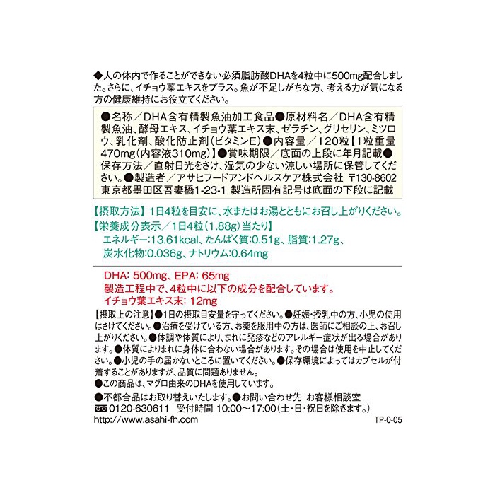 제품 개요 : 생각하는 힘이 신경이 쓰이는 분에게.남의 체내에서 만들 수 없는 필수 지방산DHA를 4 입중으로 500mg배합.게다가은행나무잎 엑기스를 플러스 했습니다.