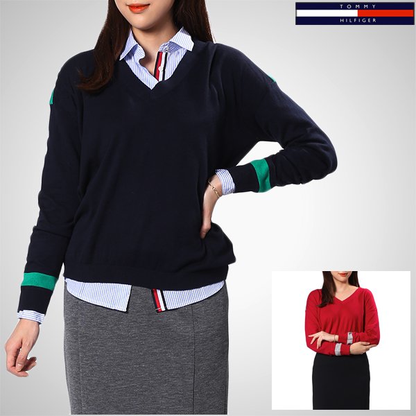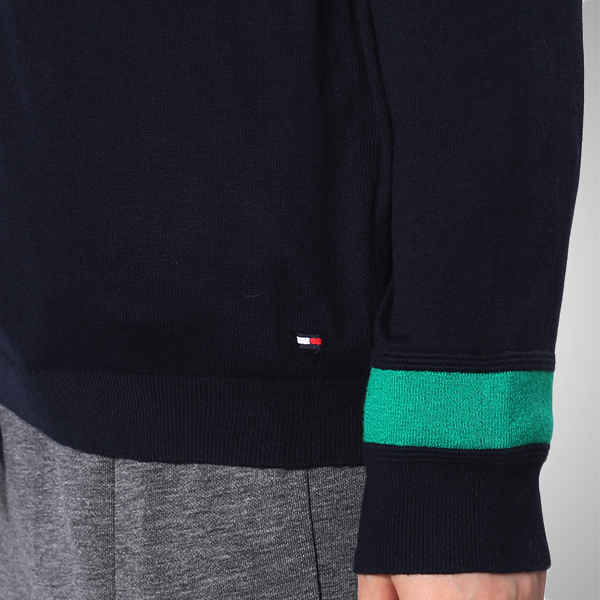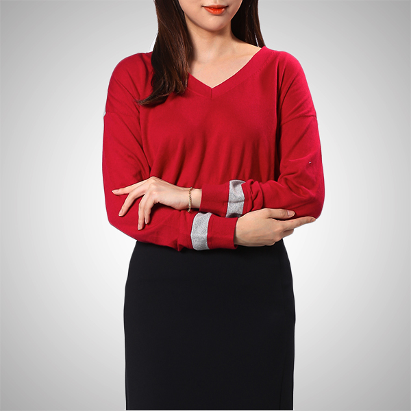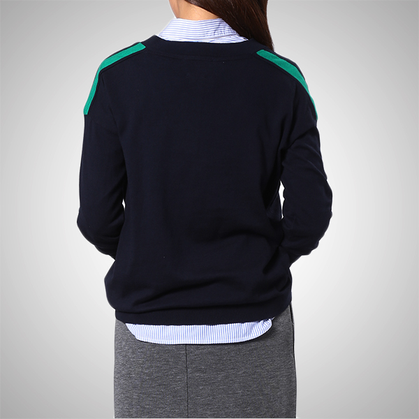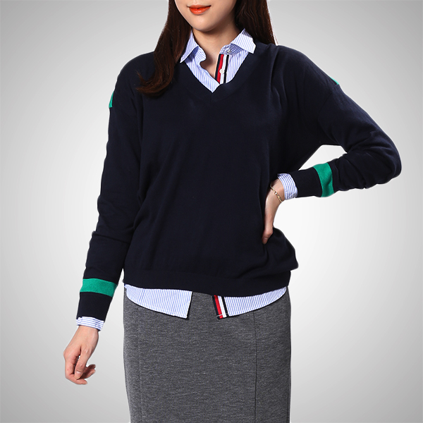 솔리드한 컬러감에 소매와 어깨의 컬러 티핑 디테일이 돋보이는 브이넥 스웨터입니다.