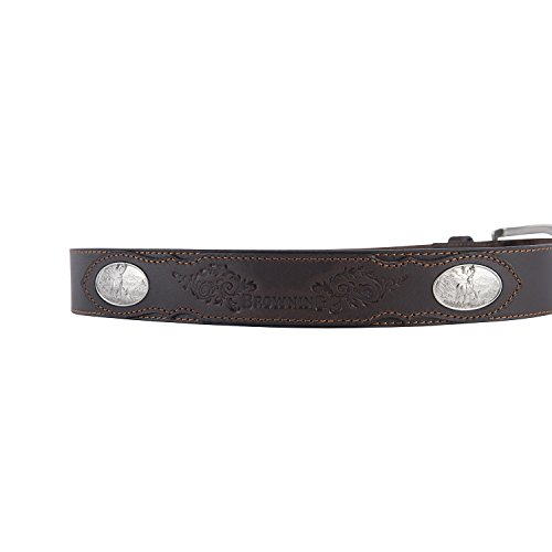 -. Feature : 1 5/8" Full Grain Cowhide Leather / Four engraved concho ornaments sporting antiqued-silver finish and deer scenes