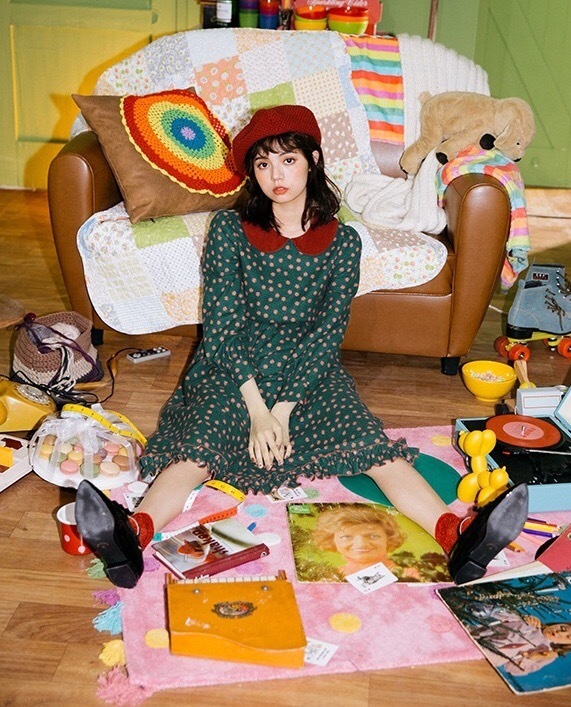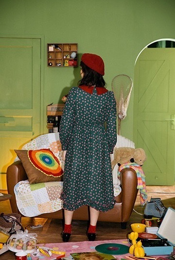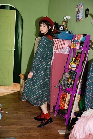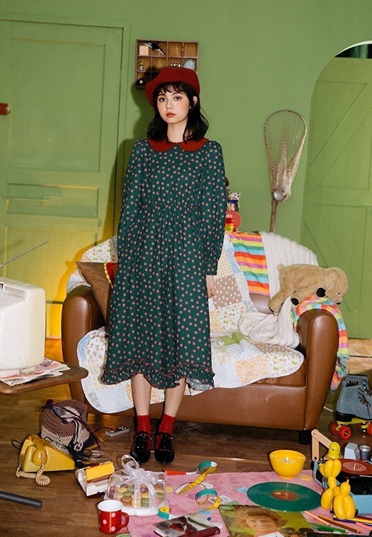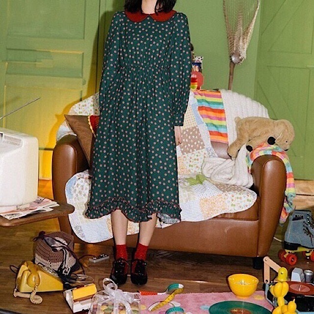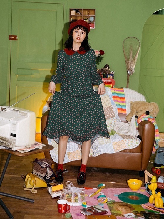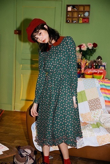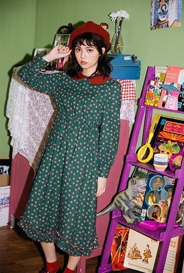 深みのあるカラーと可愛らしいデザインが印象的な膝下丈ワンピースです。