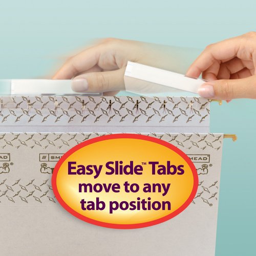 -. Feature : Seven times stronger than the leading competitor's hanging folder / Heavy duty oversized Easy Slide Tab easily slides and secures into any position / Easy Slide Tab is compatible with labels from most common label makers - simply slide label tape into tab / Specially designed reinforced channel rods are 40% stronger to reduce paper tearing and rod bending / Expands 2" for greater storage capacity / Contains 10% recycled content, 10% post consumer material