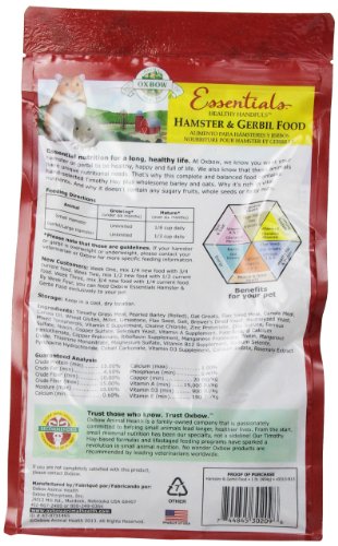 Hamsters and gerbils love this blend of timothy hay, oats and barley. Healthy Handfuls - Hamster and Gerbil Food is a complete, stabilized feed with optimally balanced nutrients that help maintain proper nutrition, weight, digestive function, dental health and quality of life for active pets. It includes a high level of fiber for digestive mobility. It does not include seeds, high-sugar fruits, or artificial preservatives, colors and flavors. Healthy Handfuls - Hamster and Gerbil Food is not intended for pregnant or nursing females. Serve with Oxbow hays to encourage foraging and provide enrichment.