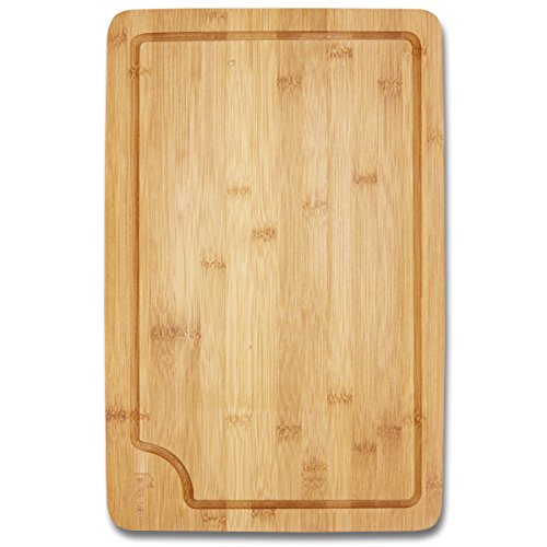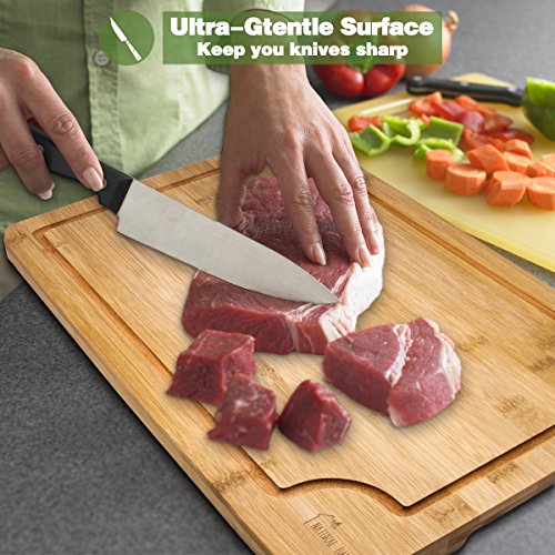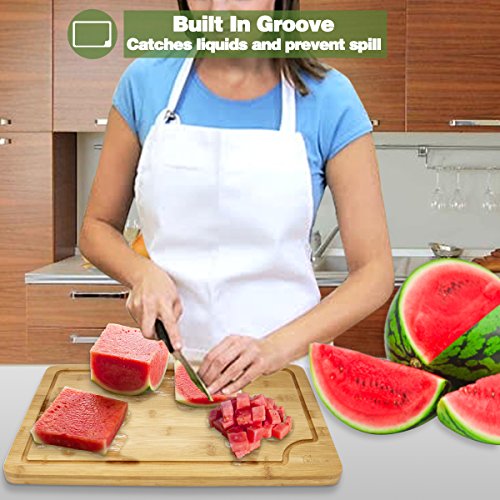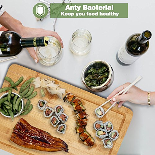TOP QUALITY - The bamboo is stronger than maple, giving you a long-lasting cutting board that will never crack or splinter, and it is moisture resistant, ensuring the best tasting meals possible for your family and friends. Notice in our reviews how many people rave about how beautiful this cutting board is it can double as a serving tray.