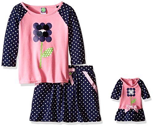 3/4 sleeve raglan sleeve top with flower applique on bodice and printed polka dot sleeves. Polka dot printed knit skirt with tie trim detail. Comes with matching doll garment.