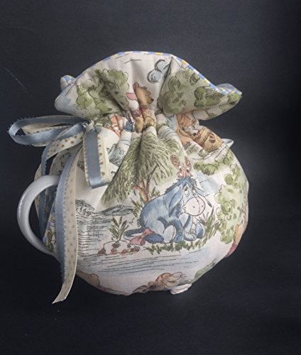 Product Description Reversible Tea Cozy cotton in classic Winnie the Pooh and tiger too - A day in the Park. It so sweet in classic Pooh with windy trees, butterflies on Eyore nose, piglet and picnics. It's adorable and so sweet. The cream colour is soft with blues and greens, pink and browns. It reverses to a light blue and white small leaves print. The cozy has a tie pull top with a satin ribbon tie top that easily adjusts to many size tea pots large.6-10cup The bottom of the cozy has an elastic bottom that can have the pot sitting on the elastic or pulled over the bottom on the tea pot to sit flat on the counter. I also have this in a bowl cozy sold separately - tea pot is for display only 0