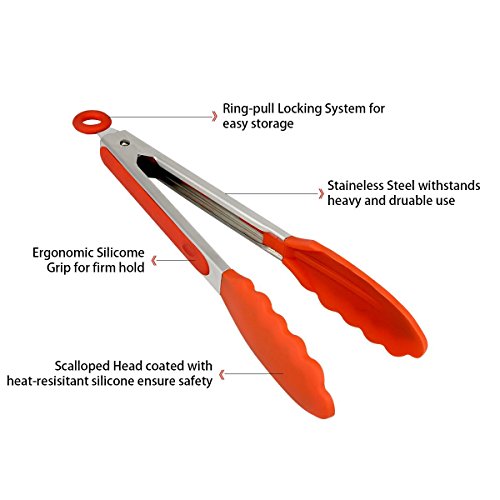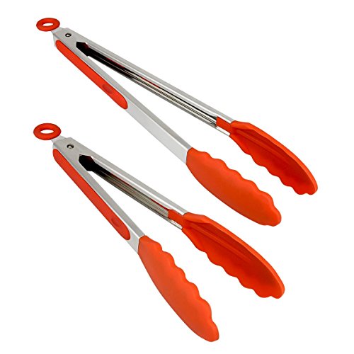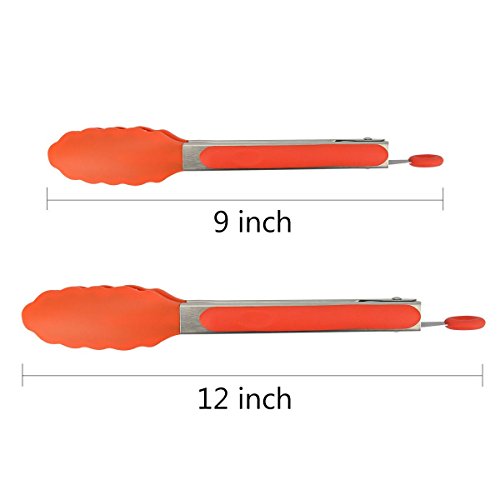 RUNFON Silicone Kitchen tongs(9 inch +12 inch),Cooking Food tongs -Heat Resistant, Non-Stick, With Locking Clip Cooking Tips for BBQ, Salads, Grilling, Baking,Serving set of 2 (Orange)