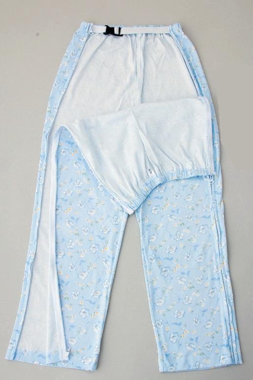 パンツはフルオープンファスナーでおむつ替えもラクにできます。ウエストバンドで立ったままでも取替えできます。