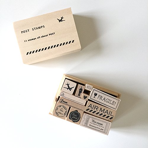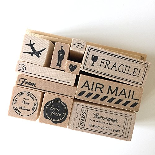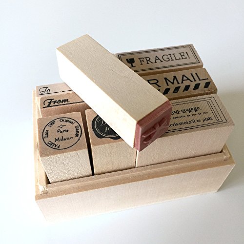 -. Feature : Wood-mounted rubber stamp set / Includes 10 pieces / Imported / 100mm x 70mm x 65mm
