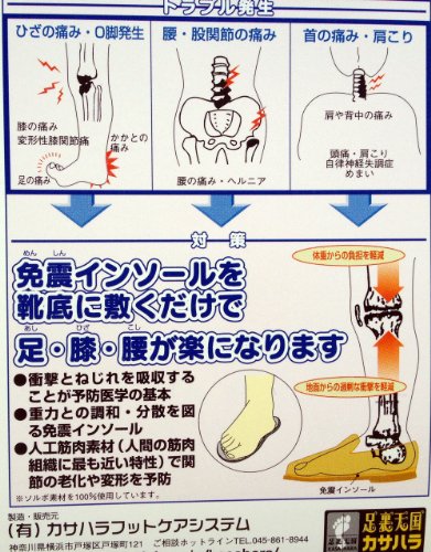 人工筋肉ソルボ100%のカサハラ免震インソールは驚異的な衝撃吸収力と免震構造により、アスファルトやコンクリートのような堅い地面より受ける衝撃から身体を守り、首・腰・股関節・膝・足首・足裏・外反母趾、タコ、魚の目の痛みを改善する抗菌加工の高性能インソールです。