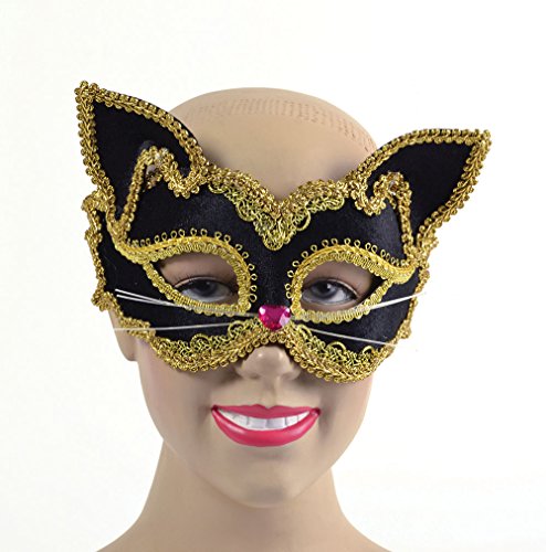 -. Feature : Black & gold cat masquerade eye mask / With whisker detailing / Great accessory for a fancy dress outfit / Colour: Black/Gold / Size: One size