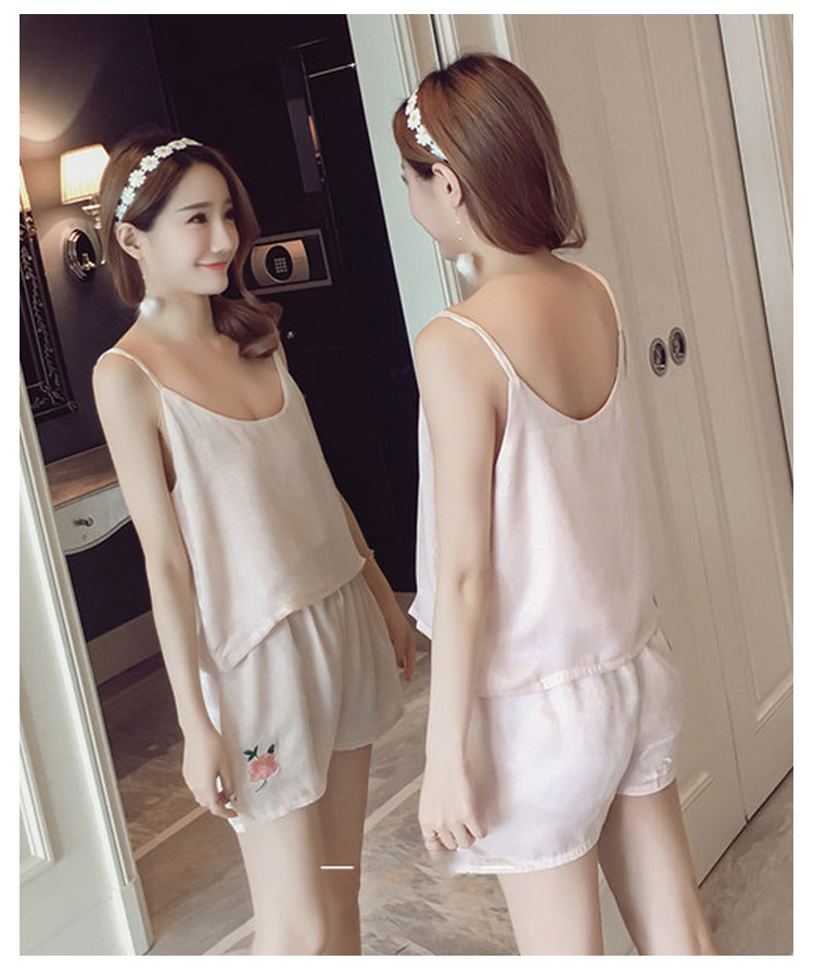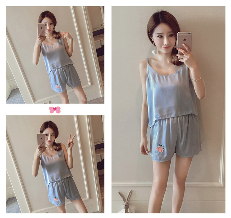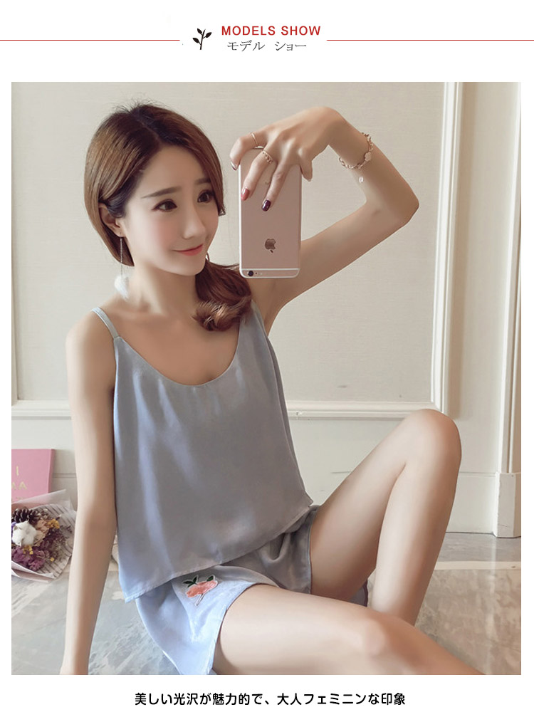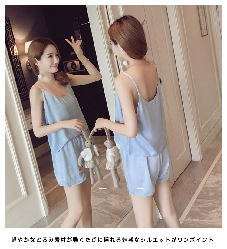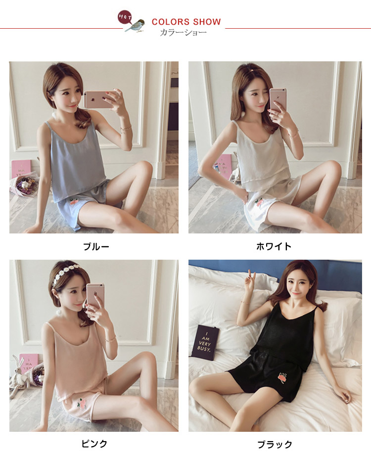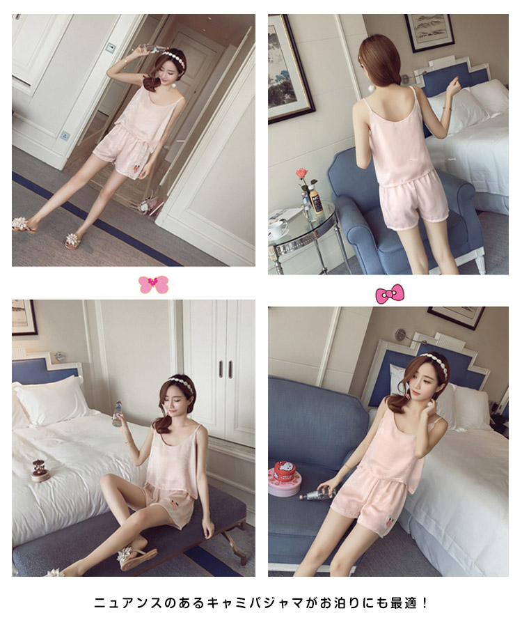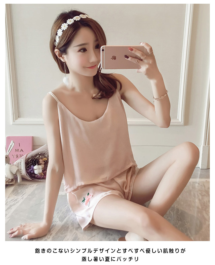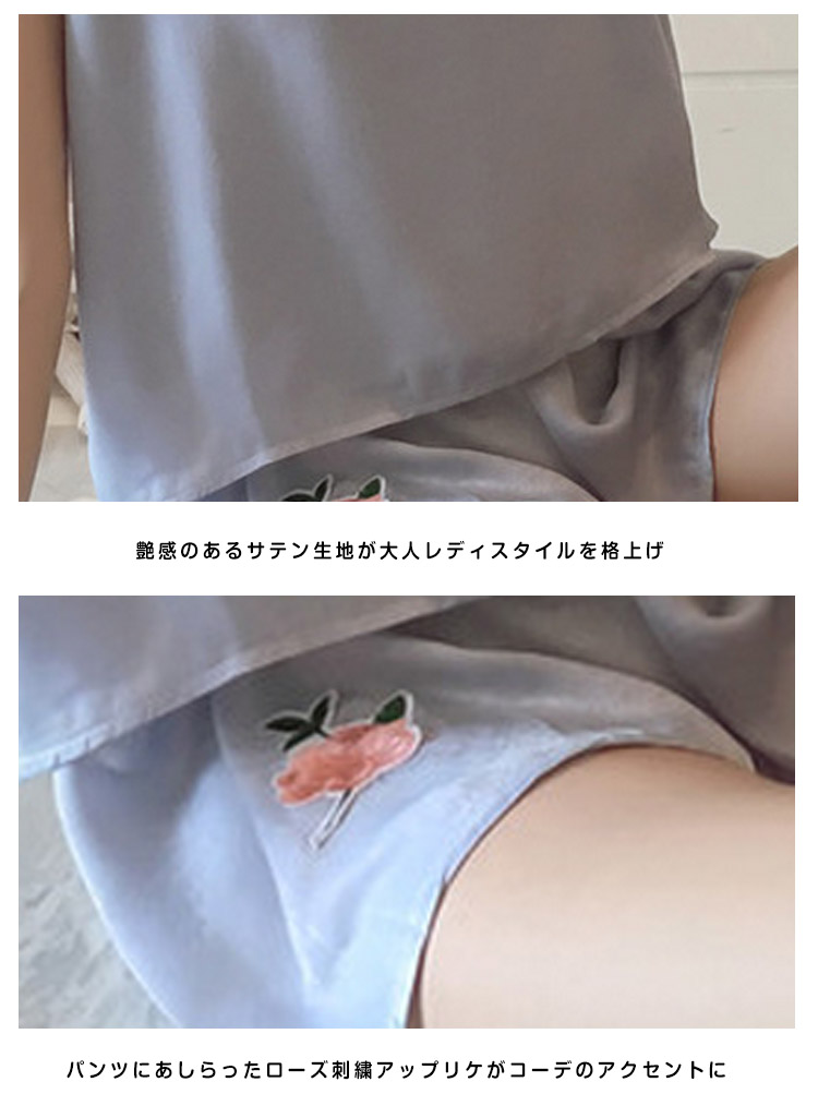 | ローズ刺繍アップリケが可愛い夏パジャマ美しい光沢が魅力的で、大人フェミニンな印象軽やかなとろみ素材が動くたびに揺れる魅惑なシルエットがワンポイント飽きのこないシンプルデザインとすべすべ優しい肌触りが蒸し暑い夏にバッチリニュアンスのあるキャミパジャマがお泊りにも最適! | |