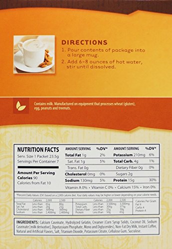 Studio : NutriWise Publisher : NutriWise Binding : Health and Beauty Product Description A nice, light almond flavor in a rich creamy cappuccino drink. Cappuccino on a diet? NutriiWise Cappuccinos are satisfying, high-protein coffee flavored hot drinks - perfect for any healthy diet or weight loss plan. Each serving is only 90 calories, low in fat and carbohydrates, and packed with 15 grams of protein. For a special treat, each flavor is great over ice for a delicious cold drink. NutriWise Cappuccinos are the perfect protein diet drink for coffee lovers. 0