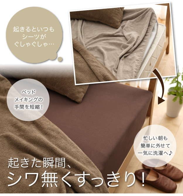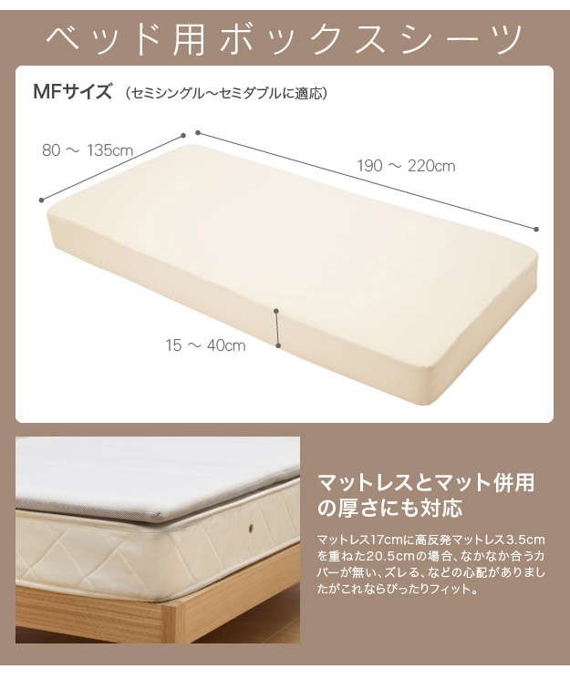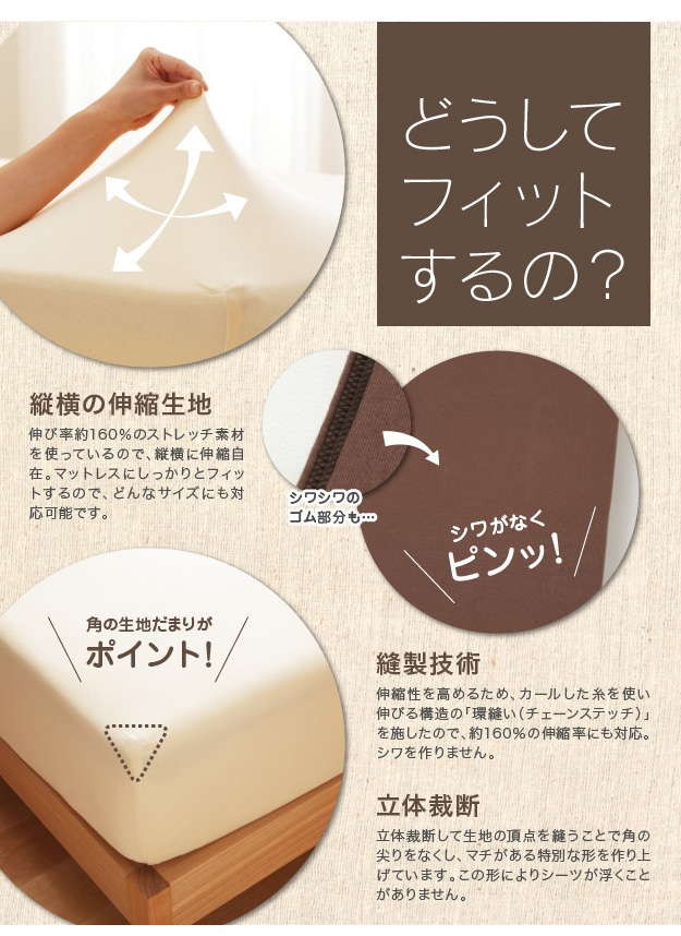 ●商品について:伸縮性に優れ、幅広いサイズのマットレスに対応できるスーパーフィットシーツ。伸縮性だけではなく吸汗性に優れたニット生地を採用。立体裁断を施すことでシワやヨレを防止。安心の日本製。