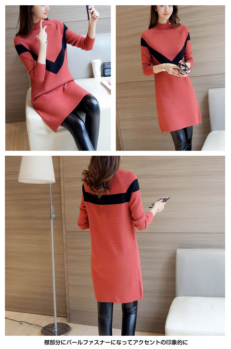 | 大人可愛いミドルハイネックニットワンピース襟部分にパールファスナーになってアクセントの印象的にしっかりとしたニット生地が保温性が高く、きぶとれもしない優れもの!ボーディラインを美しくほど良くフィットし、細身に演出してくれるこのまま一枚はもちろんのこと、ジャケットやコートのインにしても着回し力がバツグン。トレンドな6色展開で毎日のスタイリングにぜひおススメです! | |