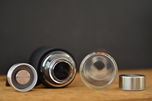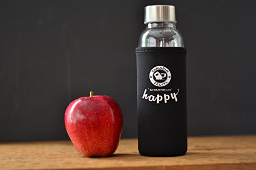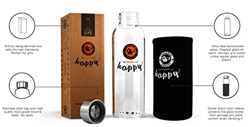 -. Feature : Ultra clear high-quality BOROSILICATE GLASS. Clearest glass on earth. Sanitary and stylish unlike regular glass and plastic. Ideal for both cold and hot drinks, including water, fruit and vegetable juices, tea and coffee. Safe and Healthy. / Stylish black nylon sleeve protects the glass bottle from impacts and you from hot or cold drink temperatures. It has a loop to easily carry. Style and Comfort. / Stainless steel cap with high quality food grade silicone seals. Virtually Spill-Proof. / Easy to use and clean. Both BOROSILICATE GLASS material and wide opening design make it very easy to wash with just water or use a brush when needed. Optimal opening size also makes it easy to fill the bottle, add ice if needed, and drink from it. Comfort and Convenience. / Exclusive "EAT HEALTHY, LIVE HAPPY" design. A lifestyle statement. Perfect gift for the HEALTH & FITNESS Lover.