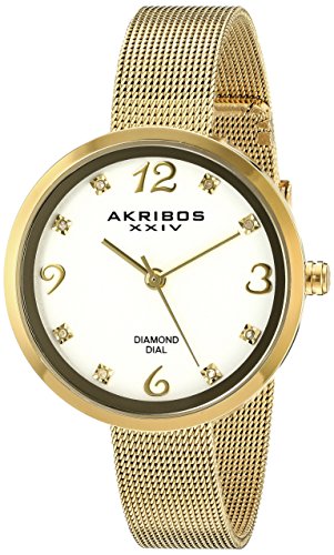Studio : TWI Watches, LLC Publisher : TWI Watches, LLC Binding : Watch Product Description This beautifully crafted AKRIBOS XXIV Women's timepiece features a lovely 34mm yellow gold tone case with a high polished bezel. Inside its petite form is a reliable Miyota quartz movement, which powers the classic two-hand complication. Each of the Arabic numerals and genuine diamond markers are hand-applied to the white dial, and the stainless steel mesh bracelet with yellow gold tone finish is the perfect finish for this elegant timepiece. 0