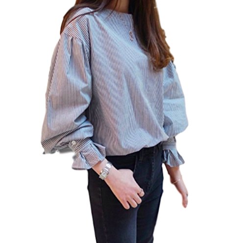 -. Feature : 絞り袖がアクセントのカジュアルブラウス / オフィススタイルにも合うデザインです。 / 【色】グレーストライプ / 【サイズ】S, M, L 詳細は下記をどうぞご覧下さい。