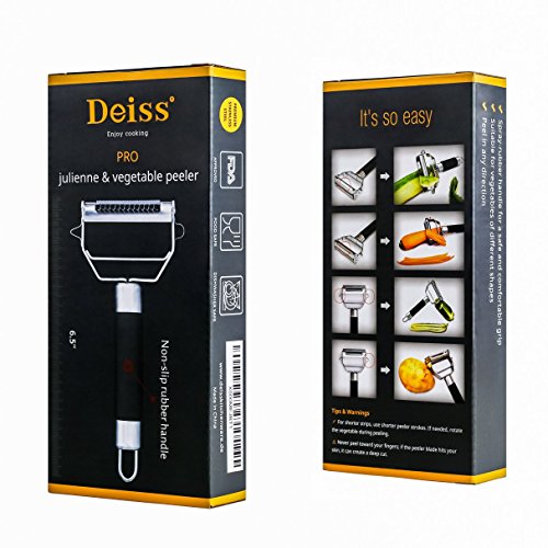 RAZOR-SHARP & MULTIFUNCTIONAL ★ Peeler, slicer, julienne, knifer, cutter is all-in-one tool from Deiss. Peeling, slicing and julienning vegetables have never been so simple. Stainless steel blades easily glide even through the toughest vegetables. Peeling and julienning potato, carrot, zucchini, cucumber, apple, avocado and more is a matter of seconds now.