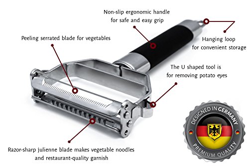 IMPROVE YOUR COOKING WITH ENDLESS DISH OPPORTUNITIES ★ Amaze your friends with new, restaurant-like recipes and make your everyday cooking entertaining. Decorating your dishes with delicious-looking garnishes, making zucchini noodles, cutting vegetables and fruit for healthy salads, slicing potato fries and cheese, removing skin from the apple or even orange - it's so easy with our Deiss julienne & vegetable peeler.