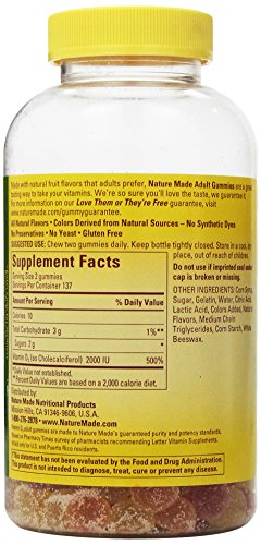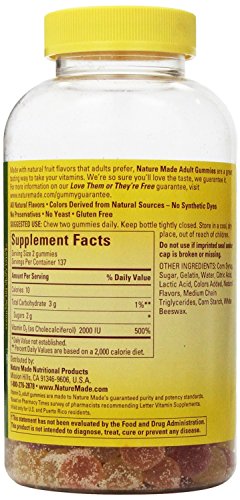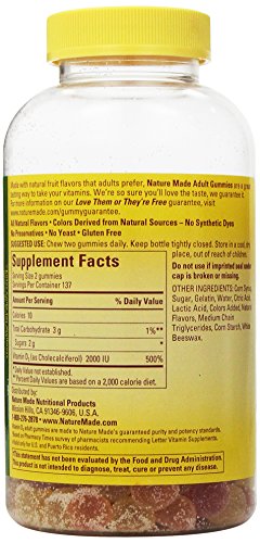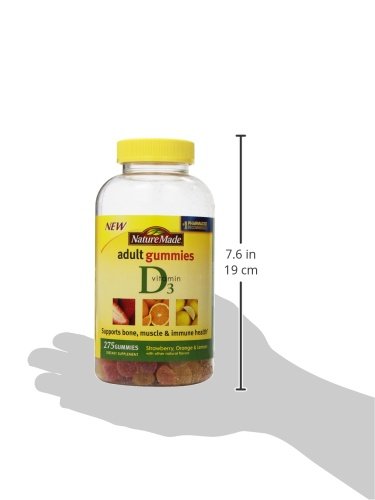-. Binding : Health and Beauty -. Brand : Nature Made -. IsAdultProduct : 0 -. Label : Nature Made -. Manufacturer : Nature Made -. ProductGroup : Health and Beauty -. ProductTypeName : HEALTH_PERSONAL_CARE -. Publisher : Nature Made -. Studio : Nature Made -. Title : Nature Made Vitamin D3 Adult Gummies - 275 Gummies