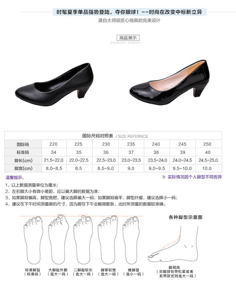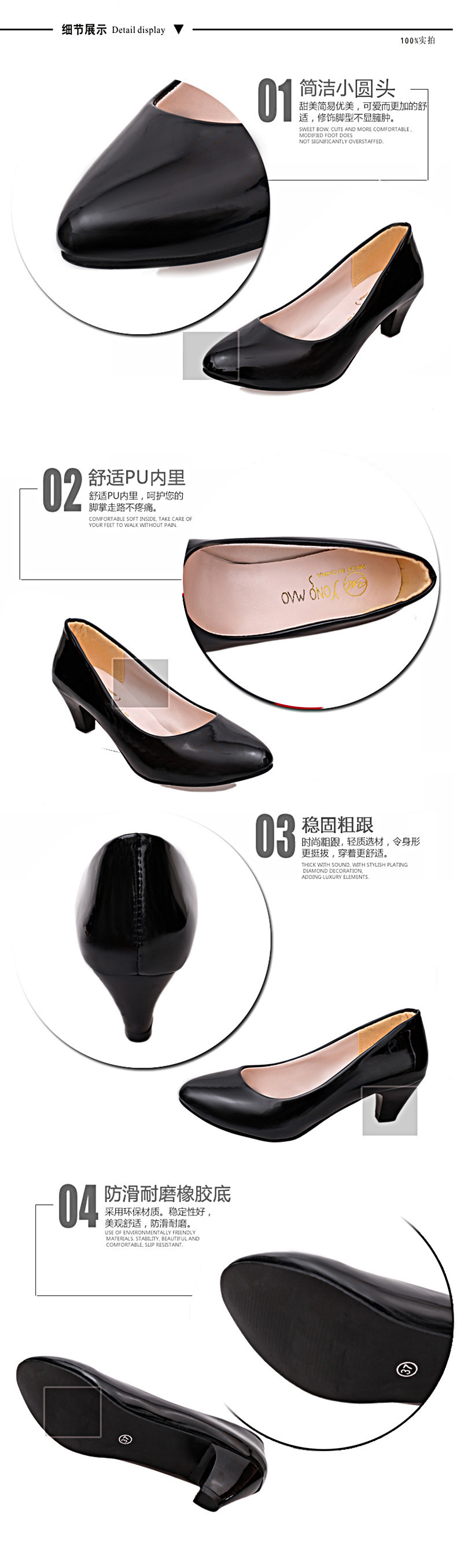 u0026nbsp; u0026nbsp;这款圆头粗跟鞋,非常时候上班族穿,站台的姑娘都可以选,很稳很舒适。当然也适合妈妈们穿哦,有2中材质供亲选择,哑光黑色是革面的,内里都是黑色的哦;亮皮黑色是漆皮材质的,内里是米色的哟!