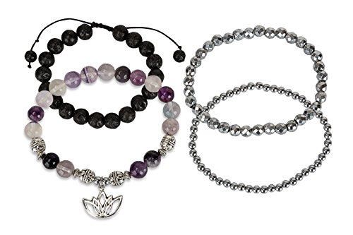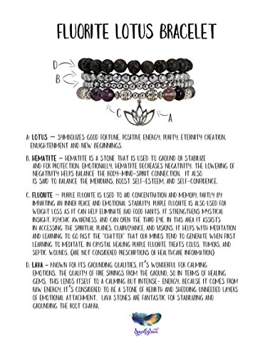 LOTUS: Represents good fortune, positive energy, purity, eternity, creation, enlightenment and new beginnings | FLOURITE: Purple fluorite is used to aid concentration and memory, partly by imparting an inner peace and emotional stability. Purple fluorite is also used for weight loss as it can help eliminate bad food habits. It strengthens mystical insight, psychic awareness, and can open the third eye | LAVA ROCK: Grounds, calms emotions releases negative emotions & protects.