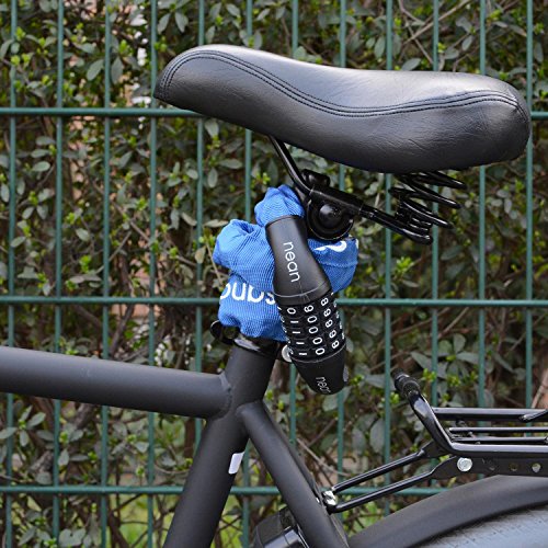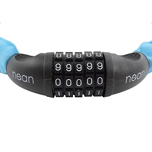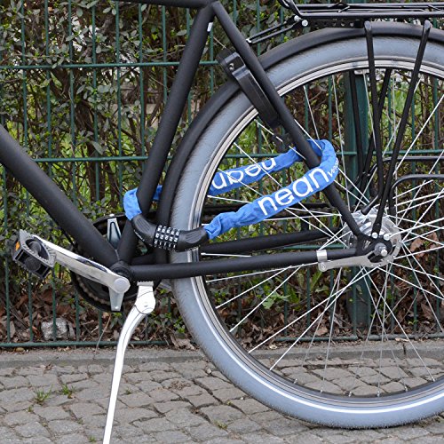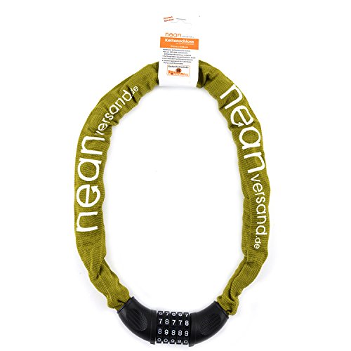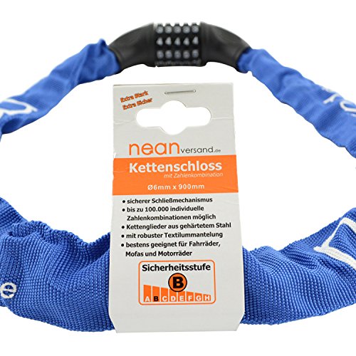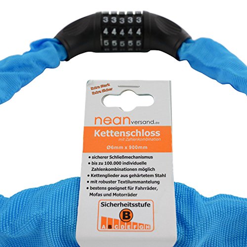 -. Feature : 5-stelliges Zahlenschloss: Besonders sicher, da 100.000 Kombinationsmöglichkeiten / 6 mm starke Kette aus gehärtetem Stahl. / Textilschlauch zum Schutz vor Lackschäden / Material: gehärtete Stahlglieder / Nylonstoff / Marke : NEAN