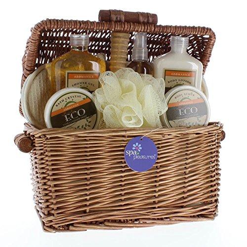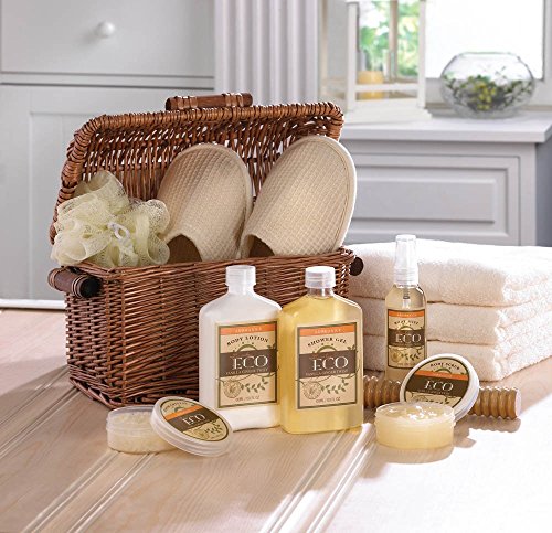 -. Feature : Bath gift basket spa is made from plastic willow and polyester wood, designed with 2 wooden handles to easy hold this basket; simple and generous / Clean gift set includes slippers,bath pouf,vanilla ginger-scented shower gel,body scrub,body lotion,bath crystal,body mist,wooden massage tool and wicker basket / Home spa basket gift contains with the aroma of warm vanilla and snappy ginger will soothe you to complete relaxation and cleanliness / Gifts baskets for women is a fantastic spa set, which includes everything needed for an indulgent bath or shower; suitable for all skin types / Luxury spa gift set comes with dimension 11.4in x 6.75in x 12in and weight 3.11 pounds; perfect as gift for valentine's day, birthday, housewarming, baby shower