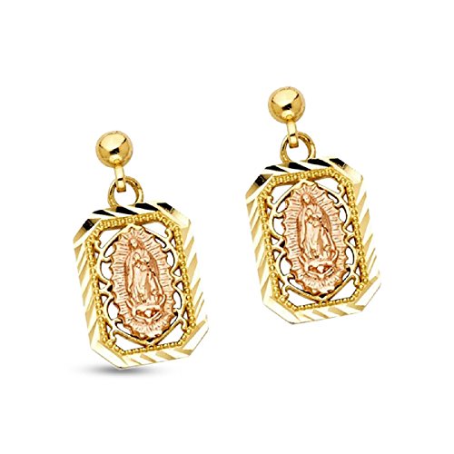 -. Title : Lady Guadalupe Dangle Earrings 14k Yellow Rose Gold Virgin Mary Hanging Portrait Two Tone 15 mm