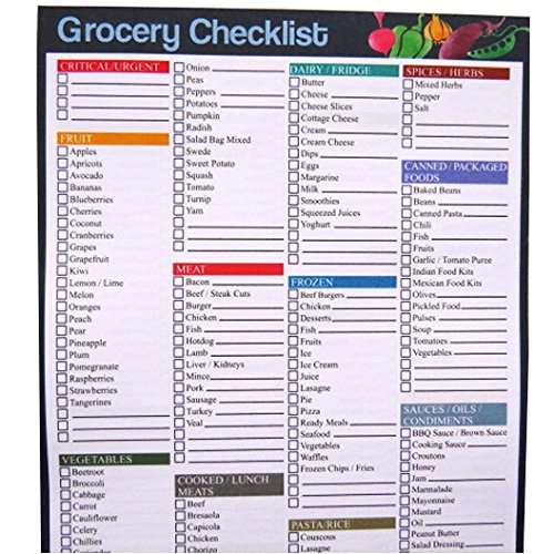 -. Feature : A5 "Grocery / Food Shopping Ticklist & Checklist Organiser Notepad" Size 8.3 x 5.8 / Organise your daily, weekly, monthly food shopping quickly, effectively / Use as a reference for discount vouchers, save money by grocery shopping for the things you need rather than impulse buy / Separated into 25 categories, Diary, Bread, Sauces etc' Lots of food items listed in these categories to tick when needed at home / cross off when obtained at the supermarket / 50 Sheets per pad on 110gsm Premium Brilliant White Offset (FSC Paper), grey board back for stability, glued on the short edge (148mm)
