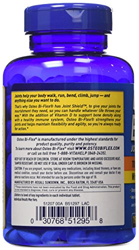 The natural aging process can add excessive stress on your joints. Annoying flare-ups can strike at any time. Add Osteo Bi-Flex Triple Strength with Vitamin D to your joint care regimen. It contains 1,500 mg of Glucosamine, a key building block of cartilage.*5-LOXIN Advanced contains high concentrations of AKBA, which is important for helping with joint flare-ups.*With the addition of our Joint ShieldY Proprietary Blend which contains Chondroitin, MSM and 5-LOXIN Advanced, plus Vitamin D, this revolutionary formula helps revitalize your joints to keep them jumpin'.*The only leading brand with 5-LOXIN Advanced. Starts working to improve joint comfort within 7 days.*Feature