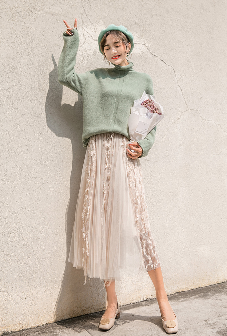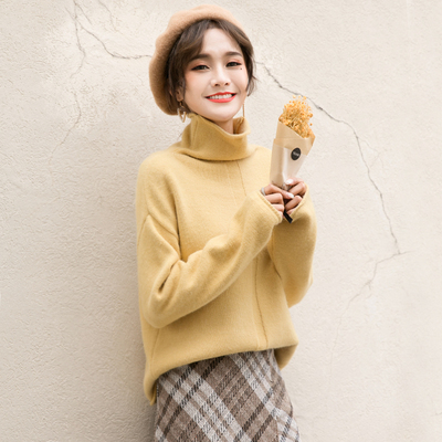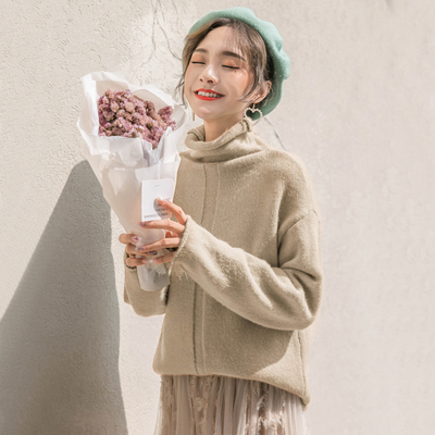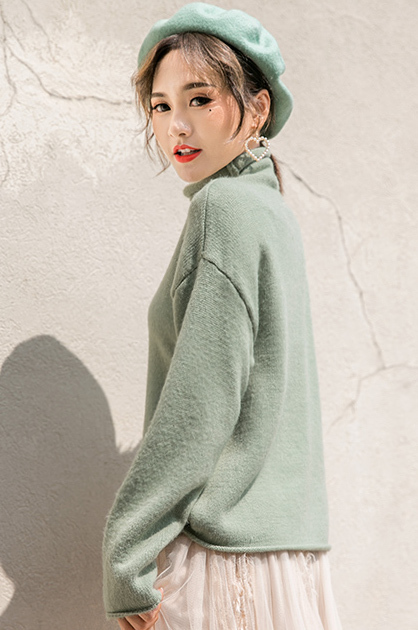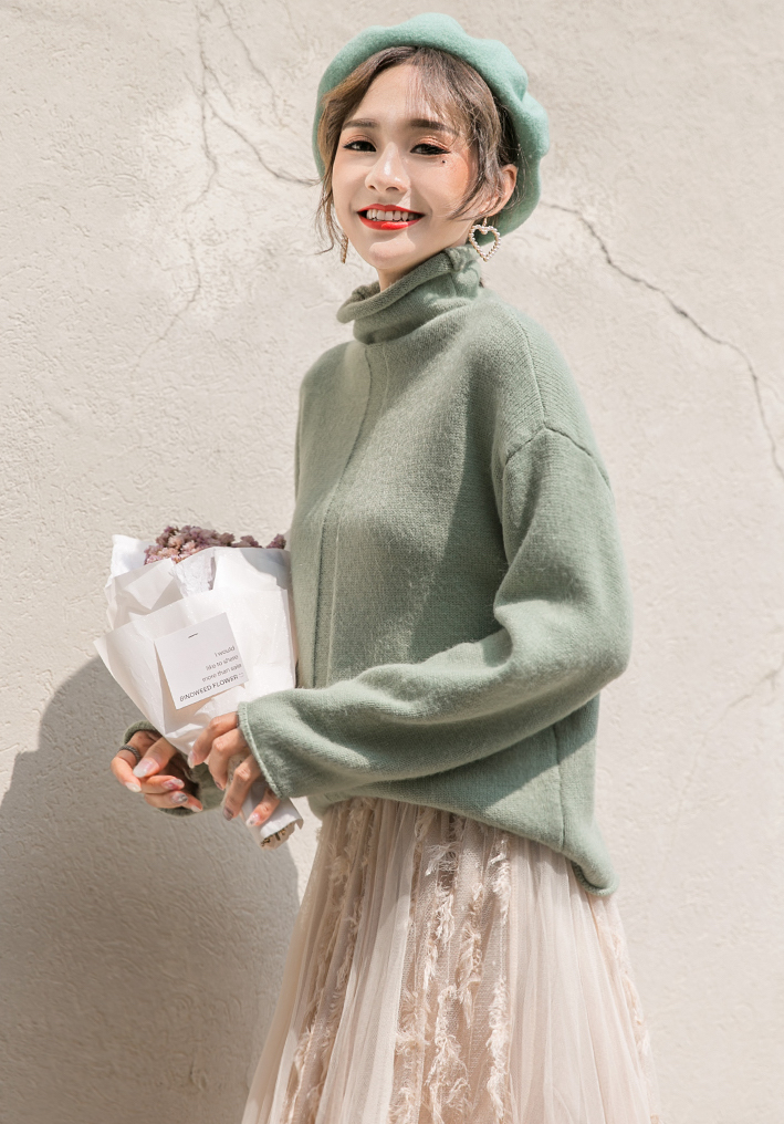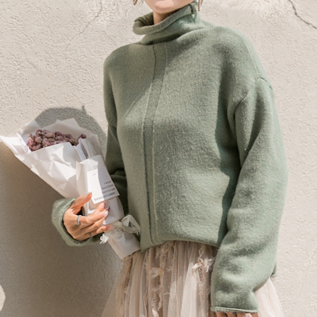 パステルカラーが女性らしくふんわりとした印象の長袖タートルネックニットです。