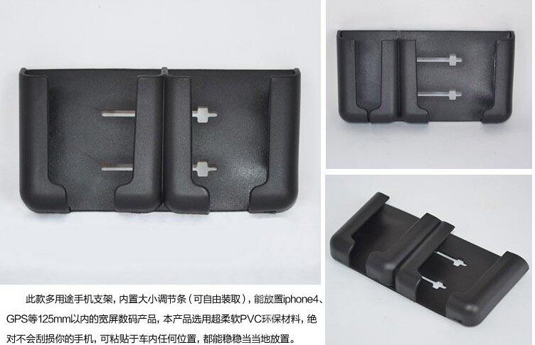 [Name] multipurpose cell phone / GPS navigator bracket[Material] PVC environmentally friendly materials[Specification] length width 135mm * 20mm * 70mm high[NW] about 65g[Weight] 100gFeaturesThe versatile phone holder, built-in adjustment bar (can be freely installed to take), can be placed iphone4, GPS and other digital products 125mm wide or less, this product is made of ultra-soft PVC environmentally friendly materials, will not scratch your phone, you can paste the car anywhere in, surely, can be placed.UsageRemove the protective paper from the back of the double-sided adhesive, paste in any position of the vehicle can affect driving
