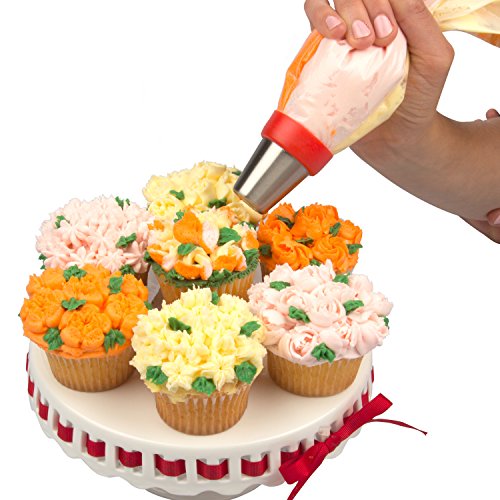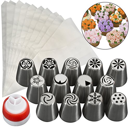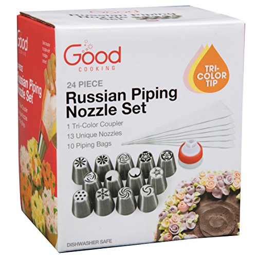 Russian Piping Tips- 24 Pc Dessert Cake Decorating Nozzle Set w 13 Nozzles, 10 Bags, and Tri-Color Coupler, - Use 3 Colors at Once