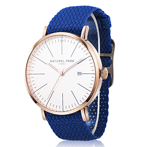 -. Binding : Watch -. Brand : Natural Park -. Color : white -. Department : Mens -. Feature : Fashion wrist watch with blue bands that you can easily change them depending on your dress or mood. White dial distinct with black marks allows you can read the time easily. It is quite suitable for a Father's day present with elegant package. / Hard mineral crystal can protect timepiece well, precise Japan quartz movement keeps good time."Simple yet stylish" design concept makes the watch a good gift for friends or family members. / Watch strap and buckle are raw-craft ensuring the timepiece is most exquisite and unique. Instructions print on package to save material embodying our environmental protection concept. / Customer Service: 30 Day money back guarantee for any reason; 12 Month warranty for quality related issues; 24 Month warranty for quality issues. / Size: Case: 41mm*9mm, Band: 250mm*20mm. (1mm=0.039"). The watch is suitable for men and women because of its unisex design. -. Label : Natural Park -. Manufacturer : Natural Park -. MPN : NP1317M-RWH -. PartNumber : NP1317M-RWH -. ProductGroup : Watch -. ProductTypeName : WATCH -. Publisher : Natural Park -. Size : Length:250mm; Width: 20mm -. Studio : Natural Park -. Title : Men's Dress Rose Gold Watches with White Dial Date Nylon Strap