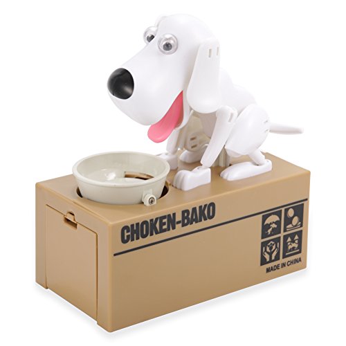 Studio : Lanlan Publisher : Lanlan Binding : Toy Product Description Dog Style Coin Money Box Piggy Bank Collecting Saving Money Bank Feature: A funny and cool way to save your money When you put the money into the dog's bowl, it will be excited to spit its tongue and then lower its head to eat the coins but it can not eat them because the coins will drop into the pedestal. The bank can be deposited about 100 coins. Ane it needs 2 x AA Batteries to munch his way through a stash of cash(not included). After installed the battery, please make sure the switch is in "ON" position. After putting the coins into the tray, the dog will have reaction. Descriptions Material:Plastic Color:Black/ White / Brown etc Size:3.74"*4.52"*3.54" Power source: 2* AA batteries(not included)
