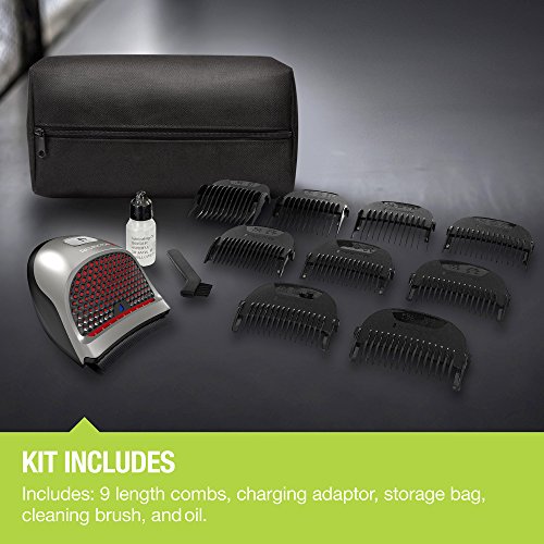 13 Piece Kit Includes– Hand-held clipper, 9 Length-adjusting combs, cleaning brush, storage/travel pouch, oil (charging adaptor also included)