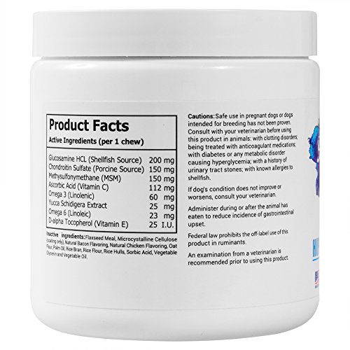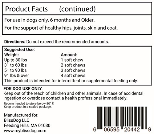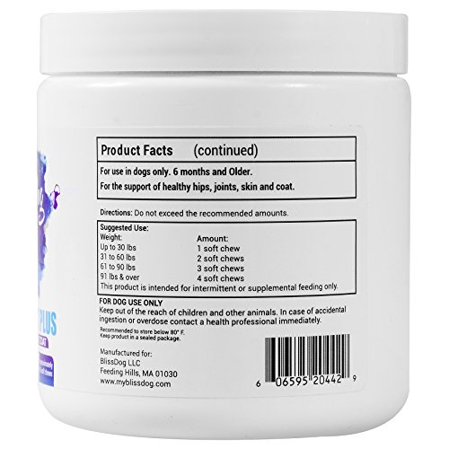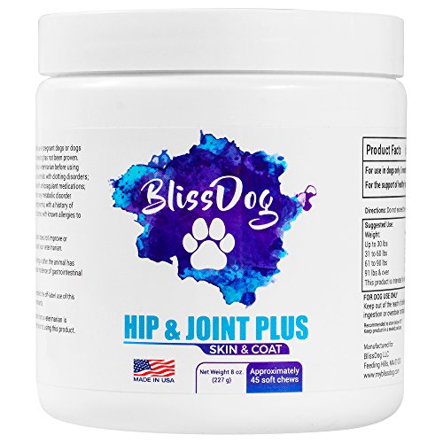 -. Title : BlissDog Hip & Joint Plus Skin & Coat Supplement for Dogs - All-Natural Glucosamine, Chondroitin, MSM, Omega 3, Omega 6, Vitamin C, Vitamin E, & Yucca - 45 Soft Chew Treats - Made in USA