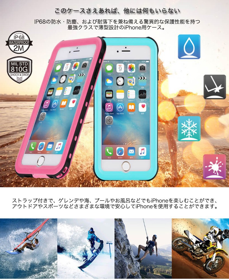 ★「対応機種」iPhone7(アイフォン7)、iPhone7 Plus(アイフォン7 プラス)★「カラー」ピンク、ブルー(青)、ホワイト(白)、ブラック(黒)★「商品特徴」IP68の防水・防塵、および耐落下を兼ね備える驚異的な保護性能を持つ最強ガラスで薄型設計のiPhone用ケース。水の浸入を保護する等級として最高レベルの「8級」を実現。最大5mまでの水中使用が可能。防水に加えて、細かい砂や雪からもしっかりと守ります。弾力性がありながら非常に丈夫なポリカーボネート製、外部からの軽度な衝撃を吸収する効果もあります。★「キーワード」アイホン7 / アイホン7プラス ケース 防水 防塵 落下保護 耐衝撃 カバー ポリカーボネート素材 軽量 薄型 衝撃吸収 ストラップ付属 落下防止 米軍規格「MIL-STD-810」準拠