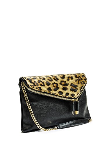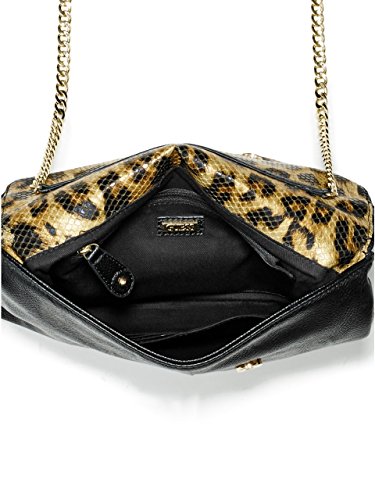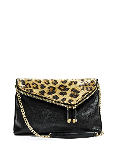 -. Feature : Pebbled faux-leather exterior. Gold-tone hardware. / Solid or contrast leopard-P.R.Int design. Fold-over flap with top zipper and snap-button closure. / Interior features zipper pocket and multipurpose pocket / Optional chain-trim cross-body strap with 17" drop / Solid lining