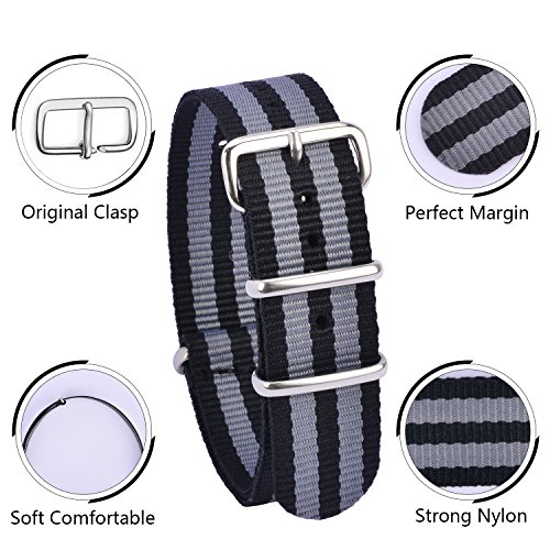 -. Feature : ¡ï FREE SP.R.ING BARS AND TOOL - Every watch strap comes with 4 replacement sP.R.Ing bars and the sP.R.Ing bar removal tool. If you bought this separately on Amazon it would cost you $6-$10. We include both of those with EVERY strap,and easy to install! / ¡ï ORIGINAL FOLD BACK DESIGN LASER CUT ¨C Like traditional NATO bands, which are longer (designed to fold back over), and use metal loops for excess strap. All of the cuts and holes are clean, no fraying or unevenness, very clean, very flat edges at the front edge of band. / ¡ï COMFORTABLE SOFT WASHABLE ¨C It is made of 1.5mm thickness comfortable material that can breathable in the wet and hot day, so it doesn't get too hot or itchy even when I sweat. These are light, sofe,nice touch,so it's incredibly comfortable to wear. Easily washed. / ¡ï SUITABLE WRIST LENGTH ¨C Length (available in 18mm, 20mm and 22mm widths) measures approximately 11-inches and fits wrists from 5" to 8.5" in circumference. 13 holes makes the band easily adjustable for a custom fit for any wrist. If your watch has an odd lug width of 19mm, 21mm, select the strap that is one mm wider. / ¡ï FULL TSTRAP WARRANTY - If you're not completely satisfied with your purchase of these quality band , simply let us know and you'll be offered a FULL refund or replacement, no questions asked. Enjoy this absolutely RISK FREE purchase today by clicking the yellow 'Add to Cart button' above.