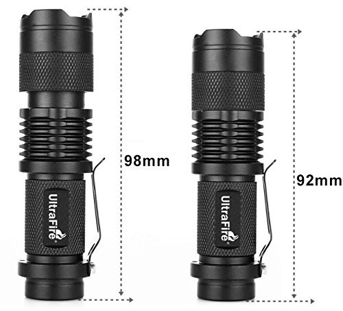 Features: Super mini size, bright, blinding effect. Skid-proof design u0026amp; waterproof design. Output bright can come to 300 lumens (MAX). Adjustable focus range for different usage, stretching to adjust its focus. Need to pull the head of the flashlight and it extends to adjust the zoom. Clip for convenience carry. Working voltage is wide and can utilize the batteries in the largest extent. Suitable for hunting, cycling, climbing, camping and outdoor activity etc. LED Specification - LED Type: CREE Q5 LED. - Luminous Flux: 300 Lumen(maximum). - LED Life: 100,000 hours. Switch: Tail-cap press ON/OFF Material and Construction: - With high quality durable Aluminum alloy casing and reflector. - Waterproof design. - With a strong solid constructions. - With body clip, for a easy carry. Support adjust the focus, with zoom in and zoom out. Power Source: 1 x AA Battery (Not included). Dimension: - Length: 93mm. - Diameter: 25.5mm. Net weight: 60g. Clock: Black. Package included: Package content: 1 x UltraFire Mini 300 Lumens CREE Q5 LED Zoomable Flashlight Torch.
