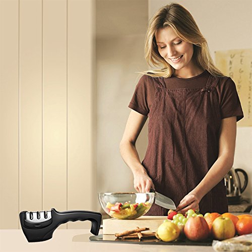 Kitchen knife sharpner design compact, easy to use, attractive and excellentdesign. 3-Stage professional knife sharpener with revolutionizing the art of knife sharpener! Let you can securely Handheld Sharpening for blade without worrying about cutting yourself.