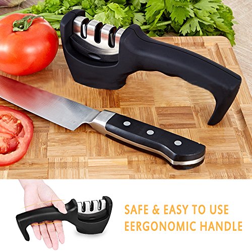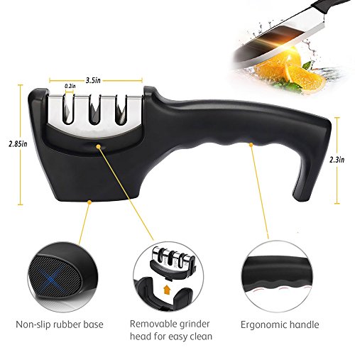 ◆ 3-STEP KNIFE SHARPENING SYSTEM: We're revolutionizing the art of knife sharpener! The 1st diamond sharpening rod repairs and straightens damaged blades before the 2nd slot sharpens to restore its V-shape. Finally, the 3rd slot fine tunes for a clean polish.
